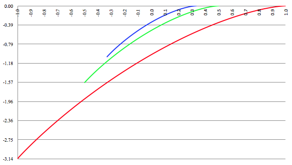 De grafiek van f (x) = arccos (ax + b) voor a = 1 (de rode lijn),