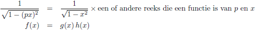 De grafiek van f (x) = 1/(1 − (px)2)1/2 voor p = 0.5 (de rode lijn),