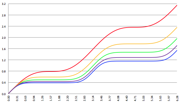 n = 8 (de paarse lijn) en n = 10 (de blauwe lijn), a = 1, c = 0