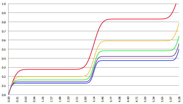 De grafiek van f (x) = cosn (ax) voor n = 20 (de rode lijn),