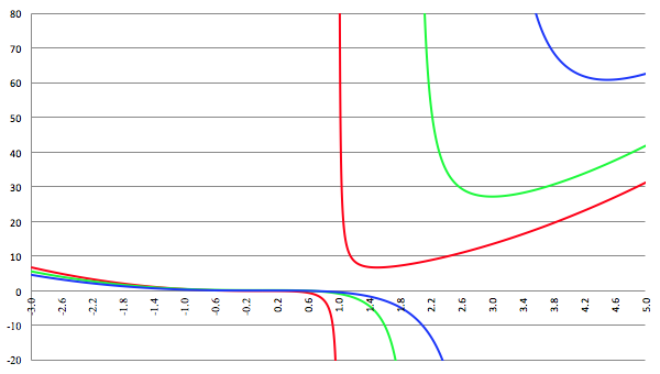 De grafiek van f (x) = x3/(x − a) voor a = 1 (de rode lijn),