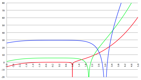 a = 2 (de groene lijn) en a = 3 (de blauwe lijn)