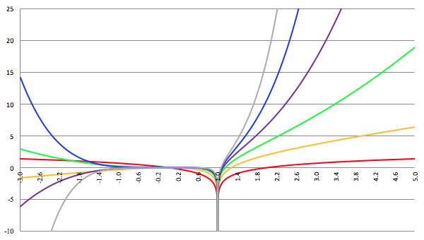 De grafiek van f (x) = xp/(x − a) voor p = 0 (de rode lijn),