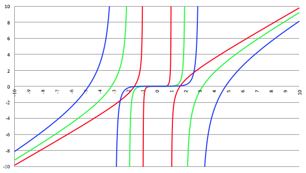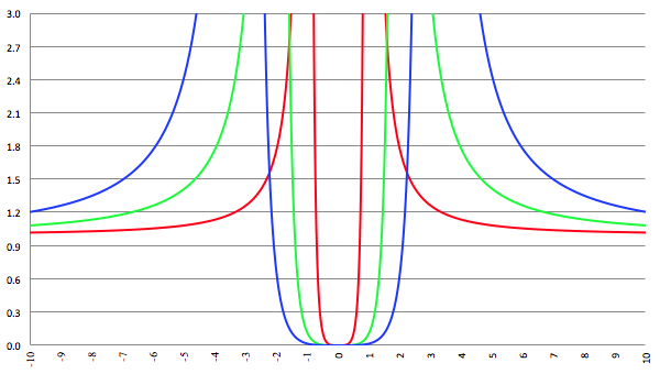 a = 2 (de groene lijn) en a = 3 (de blauwe lijn)