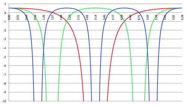 a = 2 (de groene lijn) en a = 3 (de blauwe lijn)