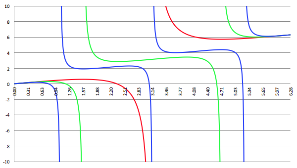 De grafiek van f (x) = cos (ax)/(1 + cos (ax)) voor a = 1 (de rode lijn),