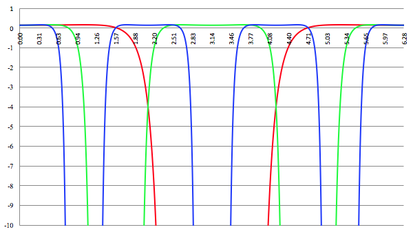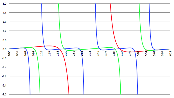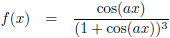 De grafiek van f (x) = cos (ax)/(1 + cos (ax))3 voor a = 1 (de rode lijn),