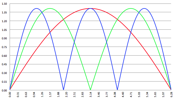 De grafiek van f (x) = (1 − cos (ax))1/2 voor a = 1 (de rode lijn),
