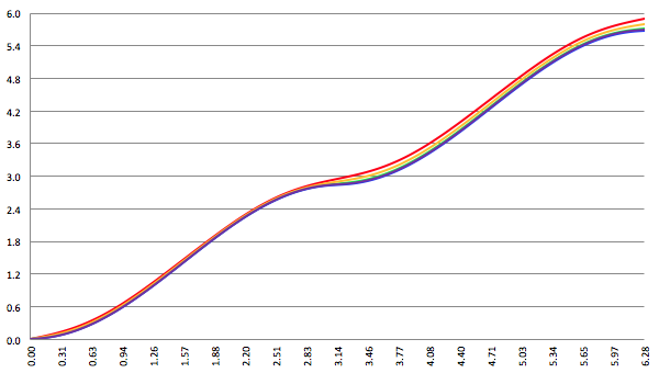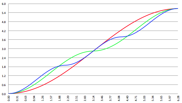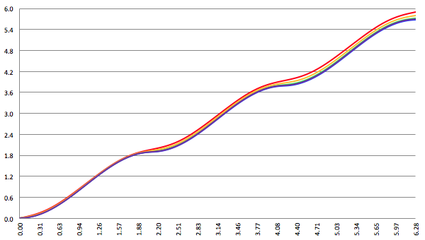 De grafiek van F (x) voor a = 1, c = 0, 3 termen meegenomen (de rode lijn),