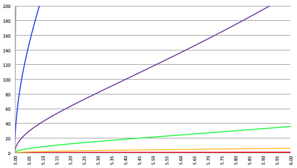 f (x) = x2 (x − 5)1/2 (de groene lijn), f (x) = x3 (x − 5)1/2 (de paarse lijn),