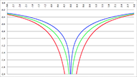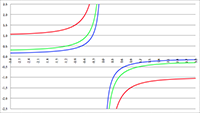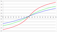 De grafiek van f (x) = 1/(1 + x2)1/2 (de rode lijn), f (x) = x/(1 + x2)1/2 (de oranje lijn),