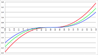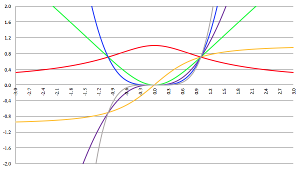 f (x) = x2/(1 + x2)1/2 (de groene lijn), f (x) = x3/(1 + x2)1/2 (de paarse lijn),