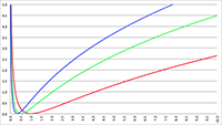 f (x) = ln x (de groene lijn), f (x) = x ln x (de paarse lijn)