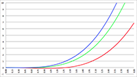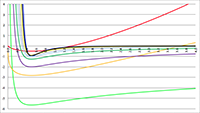 De grafiek van f (x) = 1/x2 ln x (de rode lijn), f (x) = 1/x ln x (de oranje lijn),