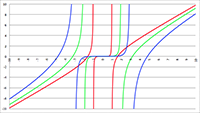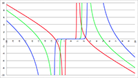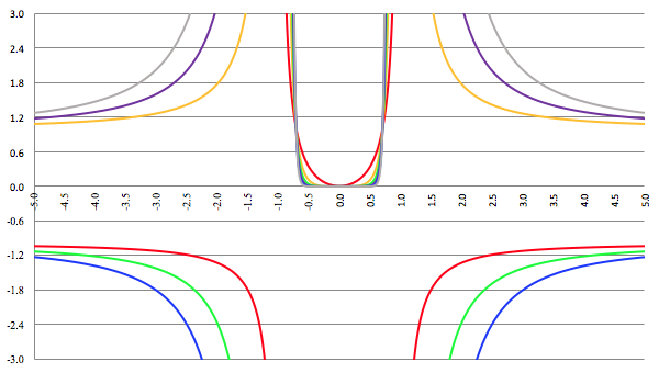 De grafiek van f (x) = (x2/(a2 − x2))n voor n = 1 (de rode lijn),