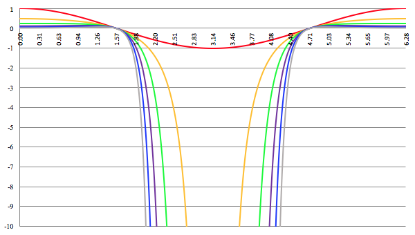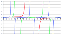 De grafiek van f (x) = cos (ax)/(1 + cos (ax))n voor n = 1 (de rode lijn),