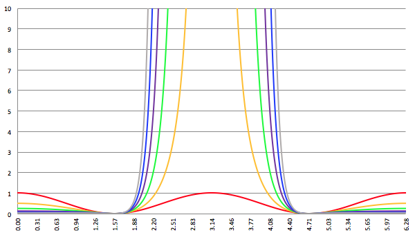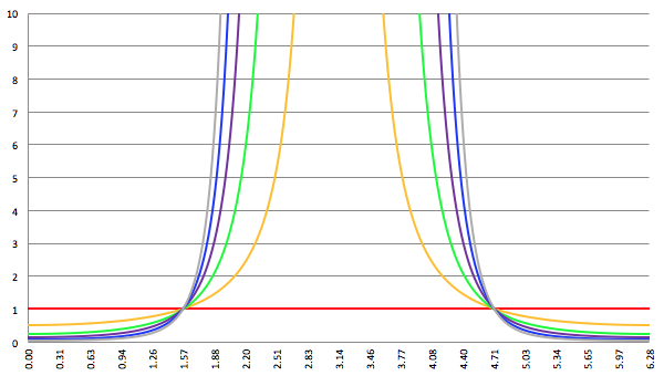 De grafiek van f (x) = 1/(1 + cos (ax))n voor n = 1 (de rode lijn),