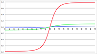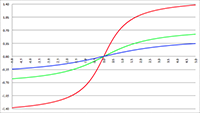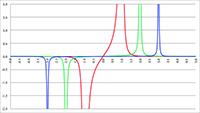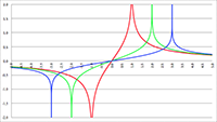 n = 2 (de groene lijn) en n = 3 (de blauwe lijn),