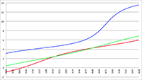 a = 0.8 (de zwarte lijn) en a = 2 (de donkerblauwe lijn)
