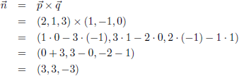 Het uitwendig product van de richtingsvectoren p en q is een normaalvector van beide vlakken (want ze lopen evenwijdig):Laten we voor het gemak nemen n = (1, 1, −1), het gaat immers om de richting en niet om de grootte.
