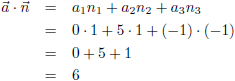 De projectie van de steunvector a op n is an. Dit is | an | maal een ‘eenheidsstukje’ van n, dus:We rekenen nu eerst het inwendig product a ∙ n uit:
