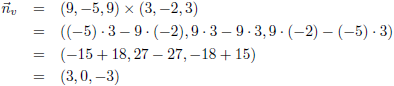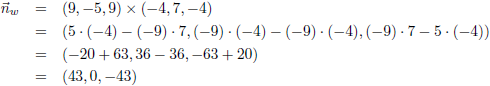 Een andere manier is om van beide vlakken de normaalvector te bepalen en vervolgens te controleren of die normaalvectoren dezelfde richting hebben. De normaalvectoren berekenen we via het uitwendig product:Indien de normaalvectoren dezelfde richting hebben (afgezien van het teken) dan moet nw een veelvoud zijn van nv. Het is eenvoudig in te zien dat deze verhouding 43/3 is, dus ook via deze methode is bevestigd dat V en W evenwijdig lopen.