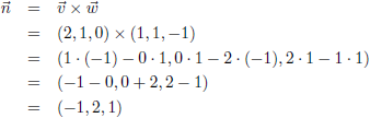 Om een normaalvector te berekenen nemen we het uitwendig product van de beide richtingsvectoren van het vlak: