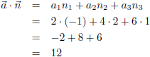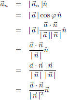 De projectie van de steunvector a op n is an. Dit is | an | maal een ‘eenheidsstukje’ van n, dus:We rekenen nu eerst het inwendig product a ∙ n uit: