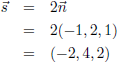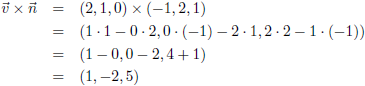 Door het uitwendig product te nemen van de eerste richtingsvector met de normaalvector krijgen we een nieuwe vector die loodrecht op de eerste richtingsvector staat en loodrecht op de normaalvector. Dat wordt dan de nieuwe tweede richtingsvector:En als loodrechte steunvector s gebruiken we de projectie van de steunvector a op de normaalvector n (die we al hebben uitgerekend):