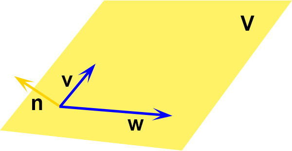 Het vlak V met richtingsvectoren v en w en normaalvector n