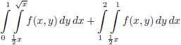 De eerste integraal is het integratiegebied links van de lijn x = 1 en kent als bovengrens y = √x, en de tweede integraal is het integratiegebied rechts van de lijn x = 1 en kent als bovengrens y = 1. Door de integratievolgorde te verwisselen ontstaat aldus: