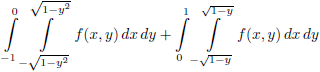 De eerste integraal is het integratiegebied boven de lijn y = 0 en kent als linkergrens x = − √(1 − y) en als rechtergrens x = √(1 − y). De tweede integraal is het integratiegebied onder de lijn y = 0 en kent als linkergrens x = − √(1 − y2) en als rechtergrens x = √(1 − y2). Door de integratievolgorde te verwisselen ontstaat aldus:Het behoeft waarschijnlijk geen betoog dat het verwisselen van integratiegrenzen een secuur werkje is waarbij een foutje snel gemaakt is.