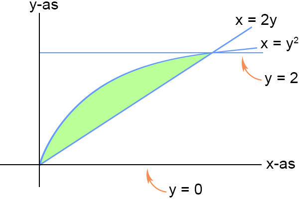 Voor de buitenste integraal geldt het volgende. Het integratiegebied kent als uiterste grenzen y = 0 (ondergrens) en y = 2 (bovengrens), dit zijn twee horizontale rechte lijnen waartussen het integratiegebied ligt ingeklemd in verticale richting. Wanneer we de integratievolgorde omkeren dan moeten we de uiterste grenzen weten uitgedrukt in x. Door y = 0 (ondergrens) in te vullen in x = y2 en x = 2y volgt in beide gevallen dat x = 0 en dit wordt de nieuwe linkergrens. Door y = 2 (bovengrens) in te vullen in x = y2 en x = 2y volgt in beide gevallen dat x = 4 en dit wordt de nieuwe rechtergrens. Deze twee lijnen begrenzen het integratiegebied in horizontale richting.