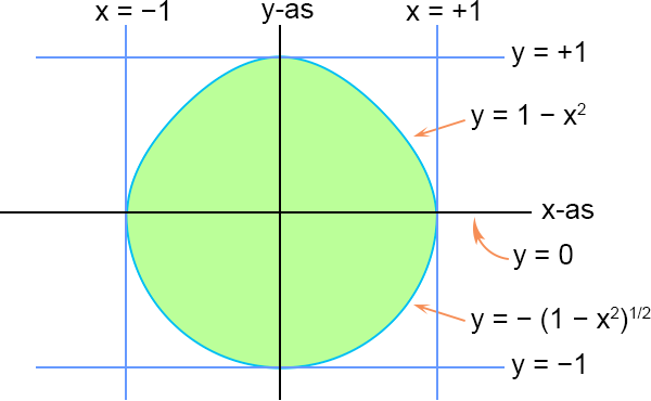 Voor de binnenste integraal geldt het volgende. Wanneer je vanaf de x-as ‘vertrekt’ dan zit je al gelijk midden in het integratiegebied. Vertrek je naar boven dan kom je de lijn y = (1 − x2) (bovengrens) tegen, oftewel x = √(1 − y) (rechts van de y-as) en x = − √(1 − y) (links van de y-as), en vertrek je naar beneden dan kom je de lijn y = − √(1 − x2) (ondergrens) tegen, oftewel x = √(1 − y2) (rechts van de y-as) en x = − √(1 − y2) (links van de y-as). Deze vier lijnen begrenzen het integratiegebied in verticale richting. Door de y-as als vertrekpunt te nemen zit je uiteraard ook gelijk midden in het integratiegebied. Vertrek je naar rechts dan stuit je boven de x-as op de lijn y = (1 − x2) (rechtergrens), oftewel x = √(1 − y), en onder de x-as stuit je op de lijn y = − √(1 − x2), oftewel x = − √(1 − y2). Vertrek je vanaf de y-as naar links dan stuit je boven de x-as op de lijn y = (1 − x2) (linkergrens), oftewel x = − √(1 − y), en onder de x-as stuit je op de lijn y = − √(1 − x2), oftewel x = − √(1 − y2). Er zijn dus weliswaar maar twee lijnen die het integratiegebied begrenzen in horizontale richting, maar die zijn verschillend voor boven de x-as en onder de x-as. Ook hier ontkomen we er dus niet aan om de integraal te splitsen.