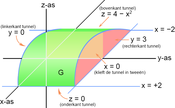 z = 0 (dit klieft de cilinder nogmaals in tweeën zodat een kwart cilinder overblijft),