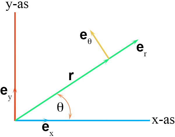 Cartesische eenheidsvectoren ex en ey, en polaire eenheidsvectoren er en eθ