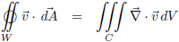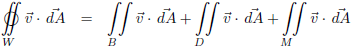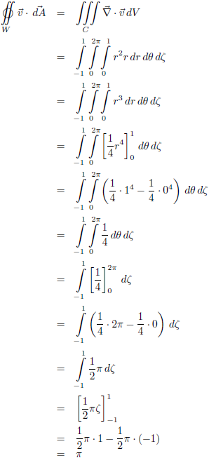 De flux door de wand (W) van de cilinder is de som van de fluxen door de bodem (B), het deksel (D) en de mantel (M):Omdat we te maken hebben met een cilinder ligt het voor de hand om over te gaan op cilindercoördinaten. Dan geldt: