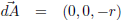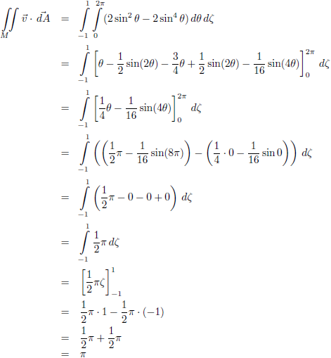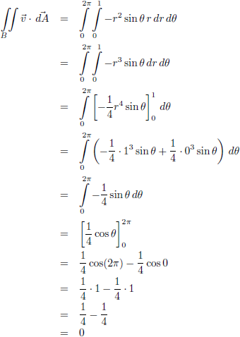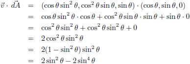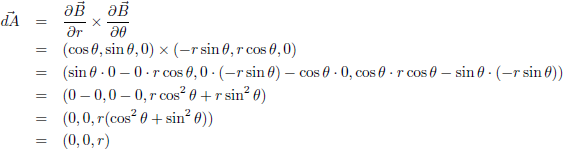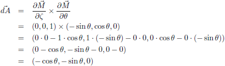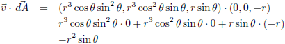 De z-component van dA is altijd groter dan nul en wijst dus naar boven, de cilinder in, en niet naar buiten wat de bedoeling is. Ik had het uitwendig product dus omgekeerd moeten uitvoeren en dat corrigeer ik nu door dA met −1 te vermenigvuldigen: