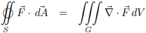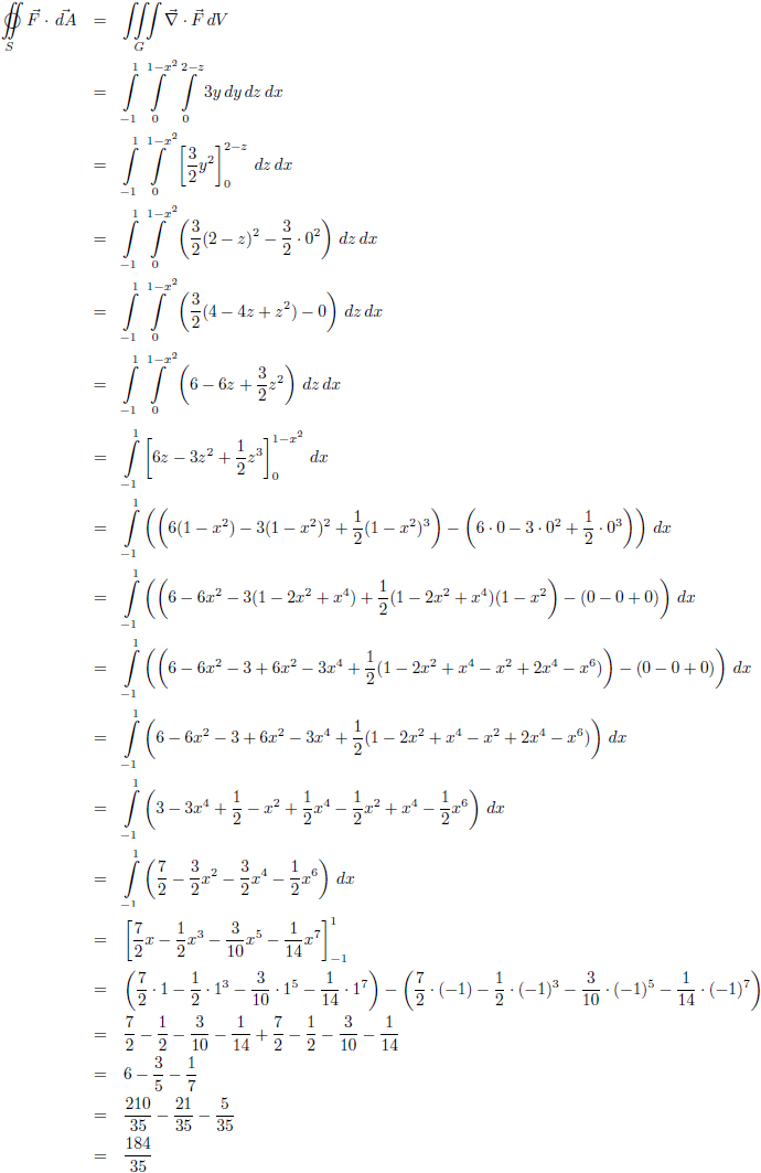 Omdat het gebied G maar liefst begrensd wordt door vier ‘verschillende’ oppervlakken (de parabolische cilinder, het x-y-vlak, het x-z-vlak en het vlak y + z = 2) wordt het hier wel heel aantrekkelijk om met de stelling van Gauss aan de slag te gaan. Volgens meneer Gauss geldt: