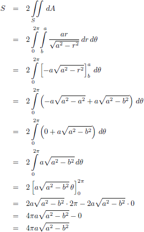 Door alle stukjes dA te integreren over het totale oppervlak S kom ik aan de oppervlakte van S. De factor twee voor de integraal komt erbij omdat ik hierboven alle negatieve waarden van ζ buitenspel heb gezet en dat corrigeer ik nu op deze manier:
