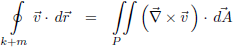 Door dit inwendig product verder uit te werken, de haakjes weg te werken, en nog een dag te zwoegen op de integraal komen we ook via deze weg waarschijnlijk wel ergens tot een oplossing. Laten we eens even heel goed nadenken. De kromme k loopt van de oorsprong naar het punt (1, 0, 1). Van daaruit kunnen we een rechte lijn m bedenken rechtstreeks van het punt (1, 0, 1) terug naar de oorsprong en dan hebben we een gesloten kromme gemaakt die het vlak P omsluit. Volgens meneer Stokes geldt de stelling van Stokes: