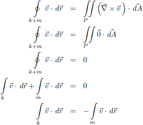 Voor de gevonden waarden a en b is de rotatie van dit vectorveld nul! Dat is interessant want hierdoor kunnen we de stelling van Stokes gebruiken als volgt: