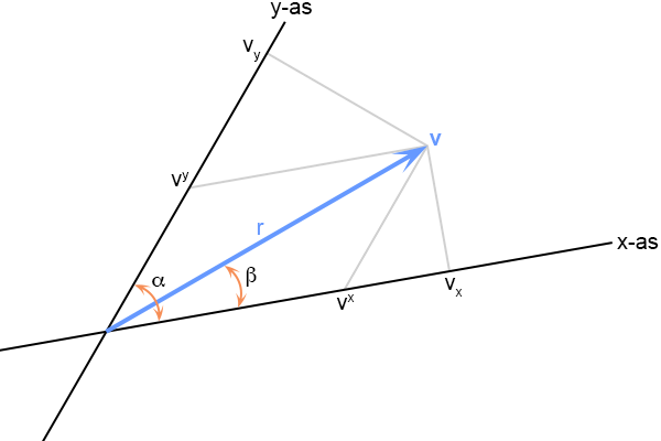 Met de projecties op de assen, de grijze lijntjes die ik trok, bepaal ik de covariante - en contravariante