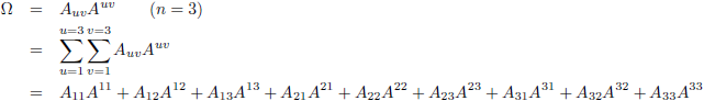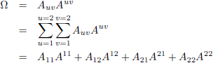 Hier zijn twee indices, de u en de v, en beide komen ze hoog en laag voor, dus over beide moet gesommeerd worden.