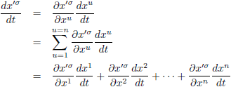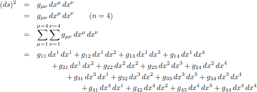 De index waar over gesommeerd moet worden heet de dode index of dummy index. De andere index heet de lopende index. Beide soorten indices kunnen ook in meervoud voorkomen (zoals uit onderstaande voorbeelden zal blijken). Om te onthouden: lopende indices bevinden zich aan beide zijden van een vergelijking en dummy indices slechts aan één zijde. En indien een index meer of minder dan tweemaal voorkomt dan kun je er eigenlijk wel zeker van zijn dat je vergelijking niet deugt (in ieder geval binnen de algemene relativiteitstheorie). Verder wil ik nog opmerken dat de sommatieconventie niet goed werkt bij Christoffel-symbolen volgens hun klassieke notatie (met de vierkante haken en de accolades), maar wel bij gebruik van de Griekse letter Γ (zoals je het dan ook vaak in moderne literatuur aantreft).