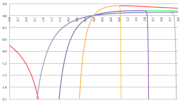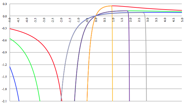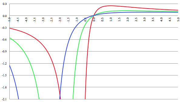 a = 2 (de groene lijn) en a = 3 (de blauwe lijn)