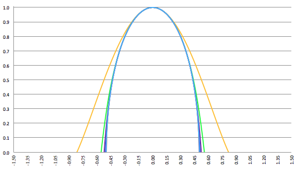 De grafiek van f (x) = (1 − (px)2)1/2 voor p = 0.5 (de rode lijn),