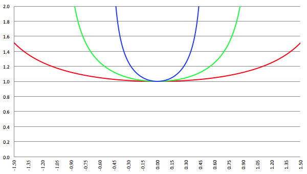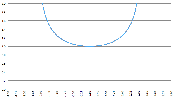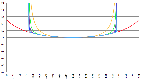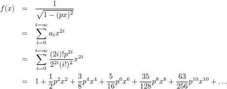 De grafiek van f (x) = 1/(1 − (px)2)1/2 voor p = 0.5 (de rode lijn),