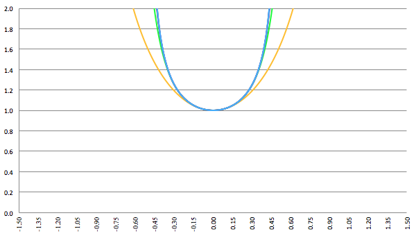 Taylor-reeks met 2 termen (de oranje lijn), 5 termen (de groene lijn),