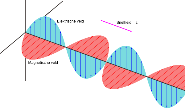 In bovenstaand plaatje is het elektrische veld blauw en het magnetische veld rood.